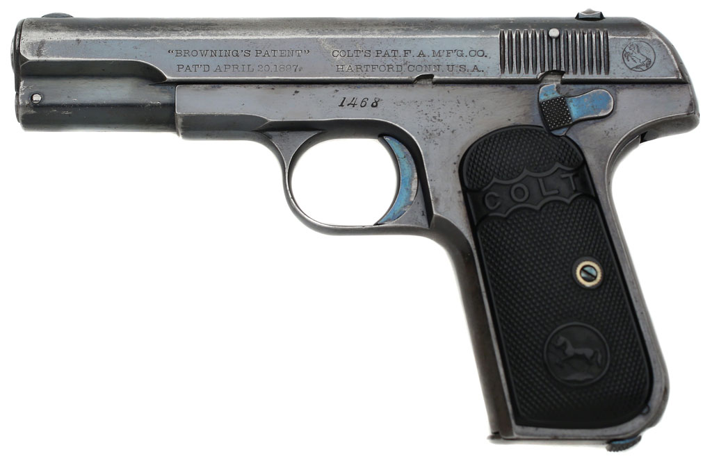 Colt Model 1903 Pocket Hammerless .32 ACP serial number 1468 - marked "Browning's Patent" with April 20, 1897 patent date.  High polish blue finish with fire blue small parts, plunge milled serrations, Type I checkered hard rubber stocks. Pistol was manufactured September 26, 1903, the first year of production.