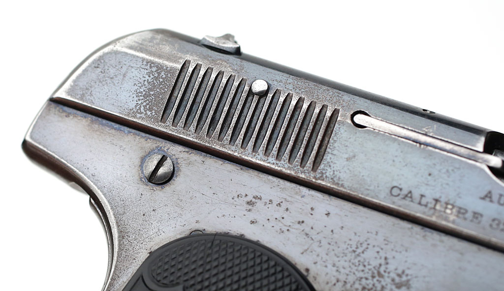 Colt Model 1903 Pocket Hammerless .32 ACP serial number 1468 (right side) - close-up of opposing thumb safety screw, a replaces part that was part of a repair performed at Colt's on July 9, 1906.  See below: