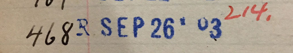 Original entry from the Colt Production Book for the Colt Model 1903 Pocket Hammerless .32 ACP pistols. There is no leading "1" as it's at the top of the page, so "468" is "1468", manufactured SEP 26, '03.  The "214." is the notation that was made in the production book which corresponds to the entry in the factory repair book (pictured below).