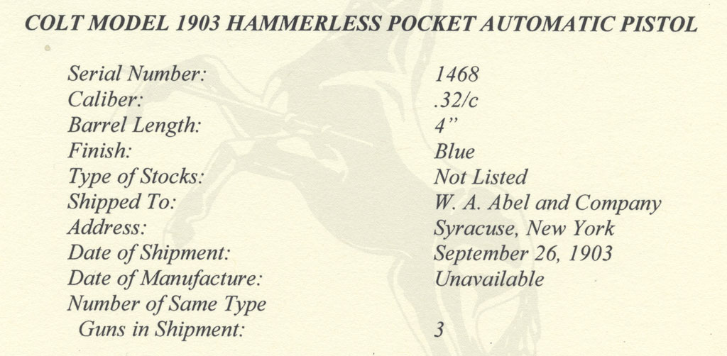Colt Model 1903 Pocket Hammerless .32 ACP serial number 1468 - Factory letter indicates this pistol was one of 3 shipped September 26, 1903 to the W.A. Able and Company, Syracuse, New York.  It was manufactured on September 26, 1903.