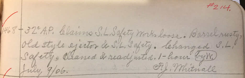 "1468 - 32c A.P. Claims S.L. Safety Works loose. Barrel rusty, old style ejector & S.L. Safety. Changes S.L. Safety, cleaned & readjusted. 1-hour (by W.) July 9, 1906. F.J. Whitnall"