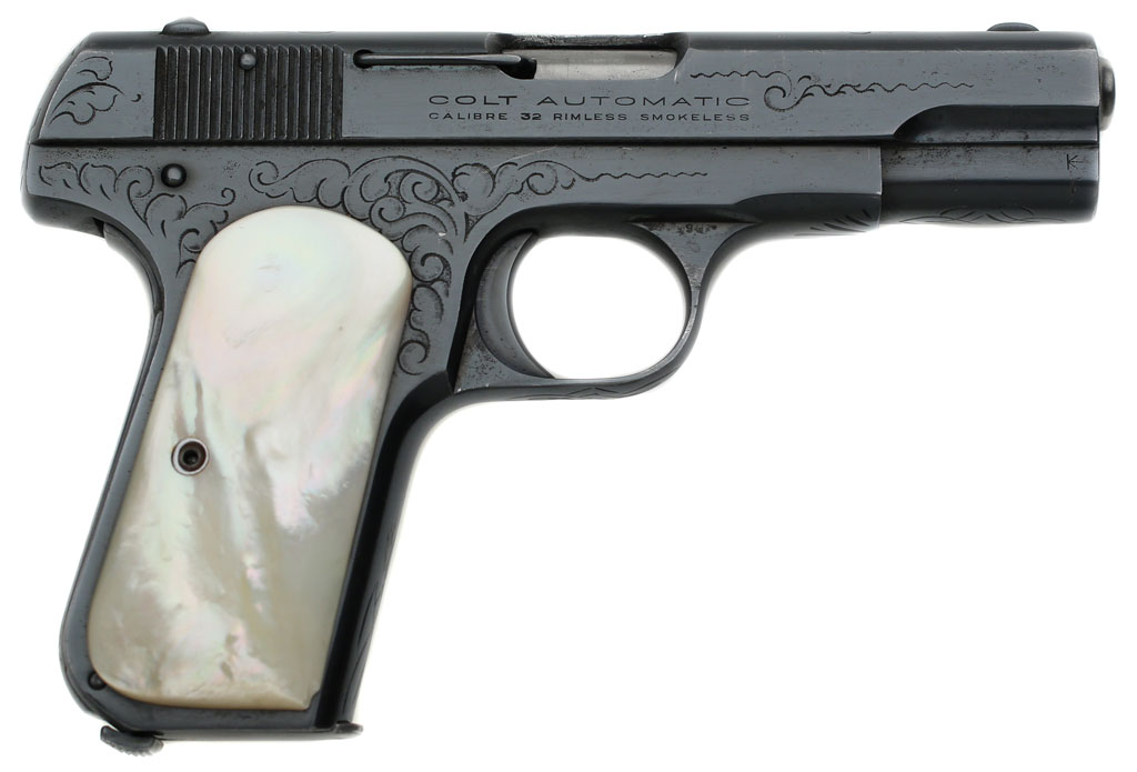 Colt Model 1903 Pocket Hammerless .32 ACP serial number 402255 - blue finish with period aftermarket mother of pearl stocks.  Pistol is factory engraved by Rudolph Kornbrath, a Colt Master Engraver from 1910 - 1937.  While this pistol appears to have minimal engraving coverage, Kornbrath is known to have engraved some of the most intricate and highly embellished and well known Colts.  Unfortunately, the pistol was refinished years ago, but is an extremely important variation as it's the only known example of Kornbrath's work on this model that has been encountered.