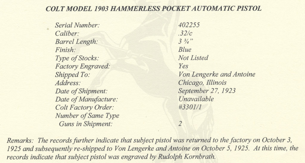 Colt Model 1903 Pocket Hammerless .32 ACP serial number 402255 - Colt Historical Factory Letter indicates this pistol was one of 2 shipped on September 27, 1923 to Von Lengerke and Antoine, Chicago, Illinois, retuned to the Colt Factory on October 3, 1925 and subsequently re-shipped to Von Lengerke and Antoine on October 5, 1925.  It was processes on Colt Factory Order #3301/1.