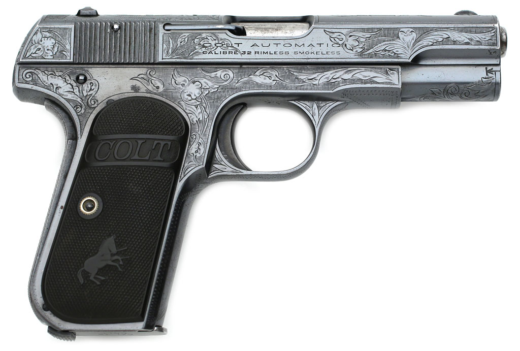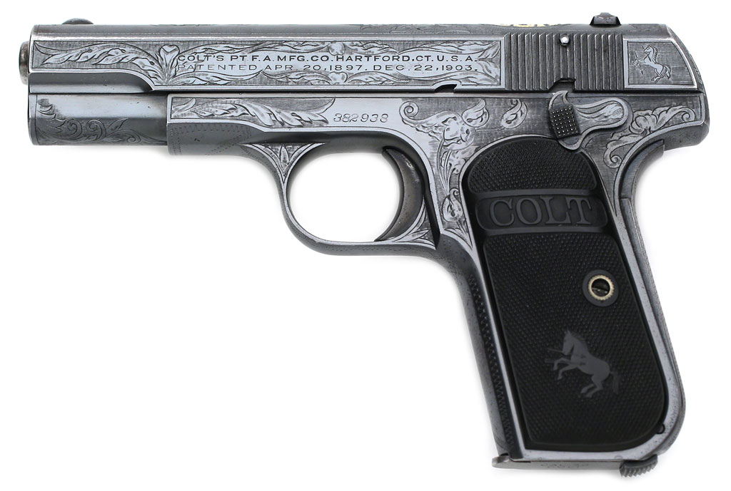 Colt Model 1903 Pocket Hammerless .32 ACP factory master engraved - serial number 382938, factory master engraved by William H. Gough, factory gold inlaid initials "EJM" most likely representing "E.M.J." as the larger middle initial typically signifies the last name.