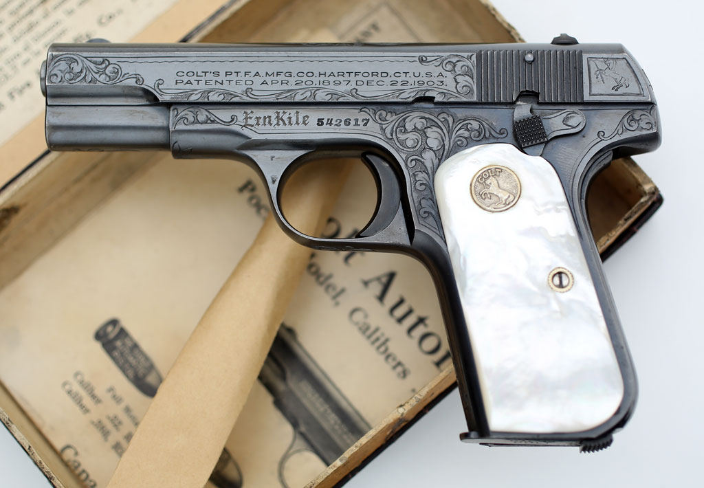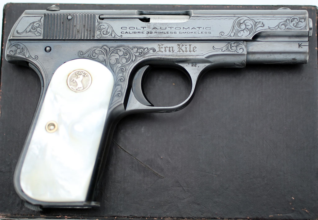 Colt Pocket Hammerless 1903 .32 ACP serial number 542617 Factory Engraved - Colt Factory Letter confirms that this gun was shipped blued, factory engraved (late style Type A engraving), on October 23, 1939 to Art Burnside & Co., Spokane, Washington for the Sheriff's Office, Paris, Illinois.  Ernest Kile was sheriff of Edgar County, IL.  It is suspected that the name on each side was inscribed locally before presentation.