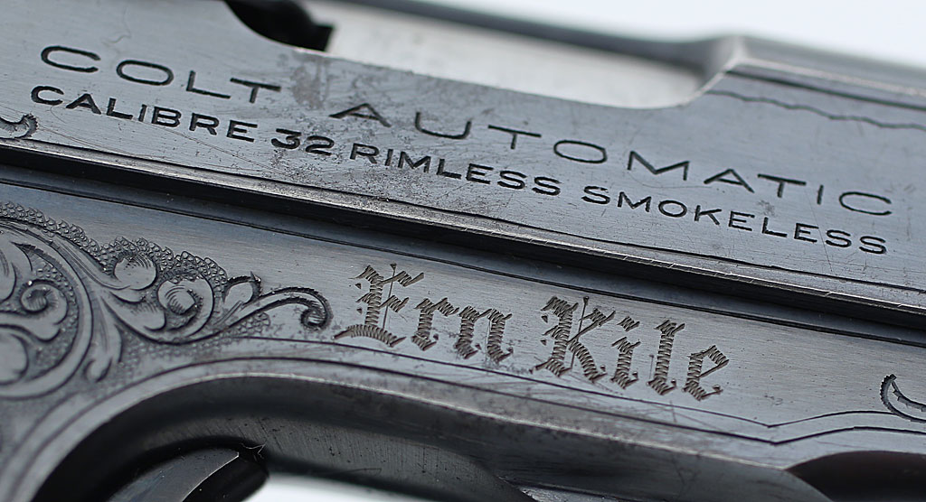 Colt Pocket Hammerless 1903 .32 ACP serial number 542617 Factory Engraved - Close-up of "Ern Kile" inscription on the right side of the frame.