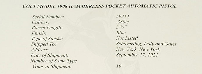 Colt Pocket Hammerless 1908 .380 ACP serial number 59314 (ca. 1921) - Pistol was one of 10 shipped to Schoverling, Daly and Gales, New York, New York, September 17, 1921.