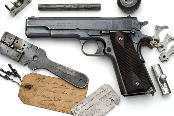 Early Colt Model of 1911 U.S. Army pictured with a number of original factory production gauges.