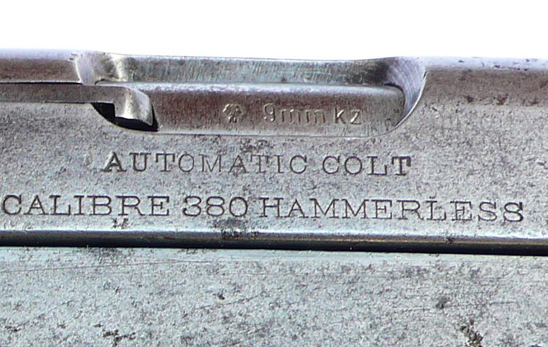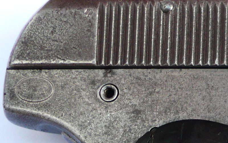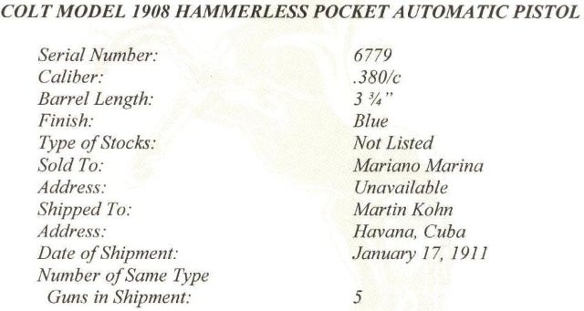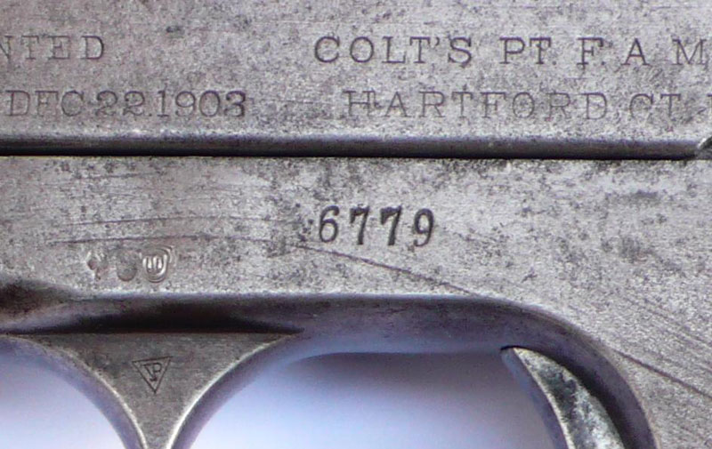 Colt Model 1908 Pocket Hammerless .380 ACP Serial Number 6779 - Produced in late 1910 and sold to Mariano Marina, address unavailable, shipped to Martin Kohn, Havana, Cuba on January 17, 1911. Pistol was purchased in the Czech Republic. Gun has turned gray, safety screw is missing, grips are wooden and completely smooth. Receiver, slide and barrel are marked with German (post WWII) C.I.P. proof marks – eagle over N. On the right side of the receiver, just behind the safety screw hole is an interesting mark – the letters "S" and "R" inside an ellipse.