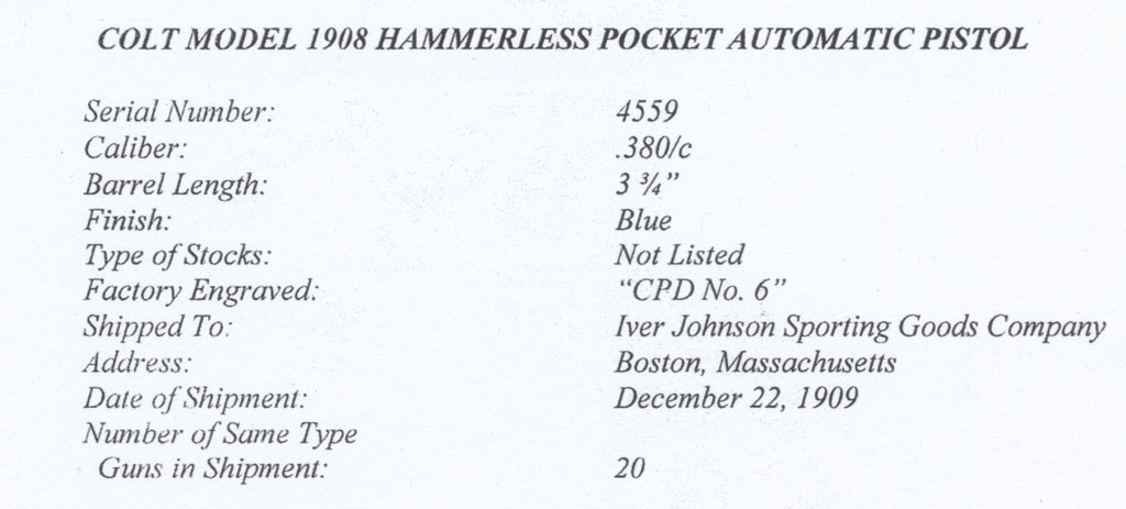 Colt 1908 Pocket Hammerless .380 ACP serial number 4559 factory inscribed "C.P.D. No. 6" on grip safety. This was one of 20 guns marked "C.P.D. No. 1-20" on the grip safety shipped to the Iver Johnson Arms Company, Boston, Massachusetts on December 22, 1909 for the Chicopee, Massachusetts Police Department.
