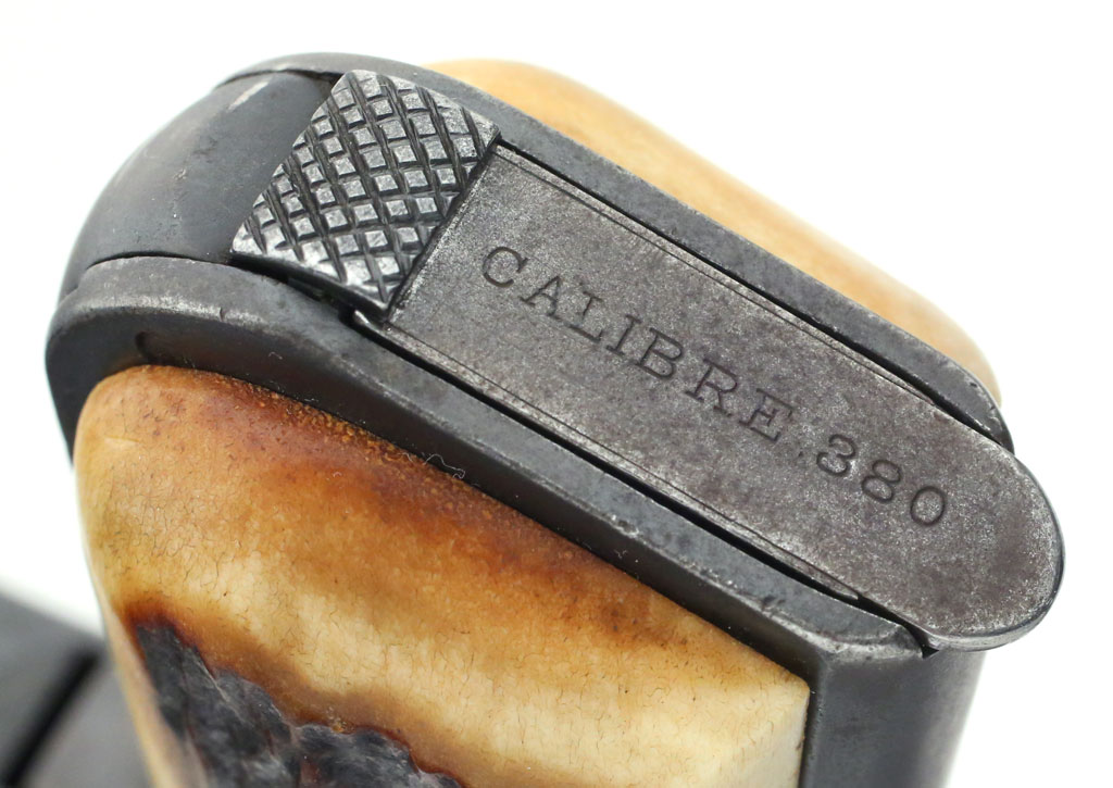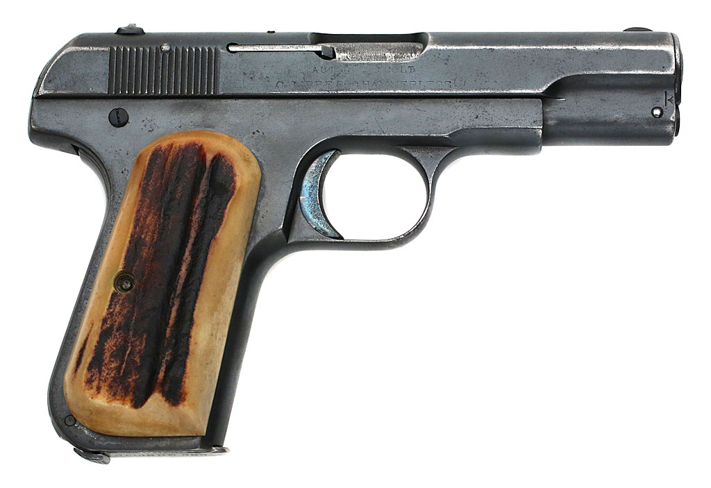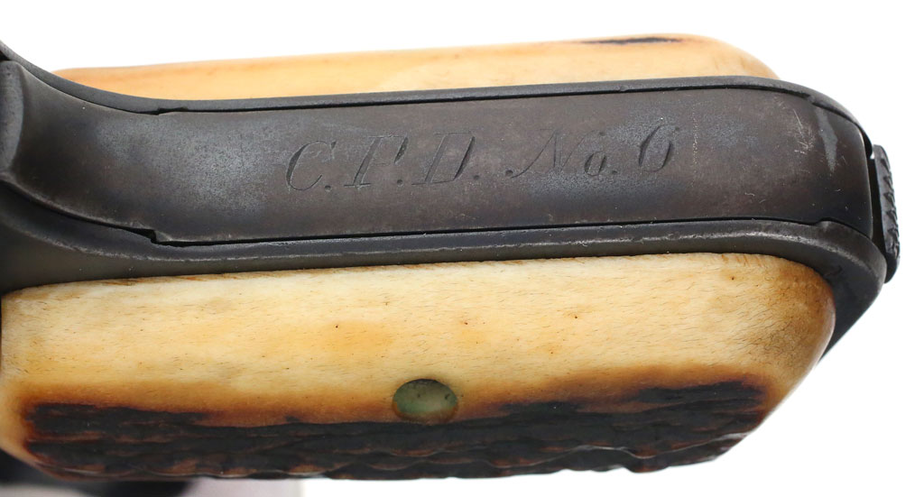 Colt 1908 Pocket Hammerless .380 ACP serial number 4559 factory inscribed "C.P.D. No. 6" on grip safety - Pistols in the serial number range 4478 - 4560 with this marking were shipped on December 22, 1909. Serial number 4559 (pictured) is the consecutive serial number and the consecutive police number to serial number 4560, inscribed "C.P.D. No. 6" on grip safety (below). The stag stocks are aftermarket replacements.