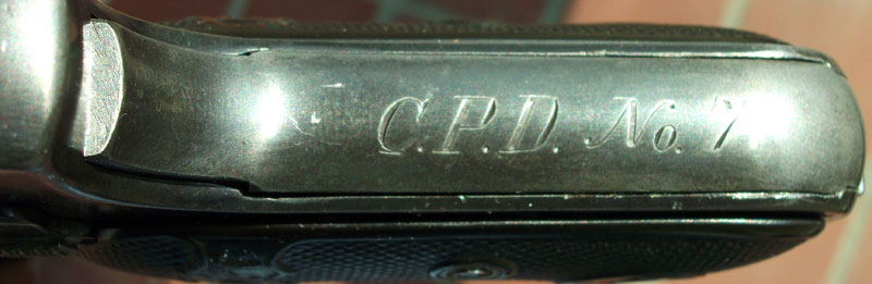 Colt 1908 Pocket Hammerless .380 ACP serial number 4560 factory inscribed "C.P.D. No. 7" on grip safety - Pistols in the serial number range 4478 - 4560 with this marking were shipped on December 22, 1909.  Serial number 4560 (pictured) is the high serial number in the shipment.