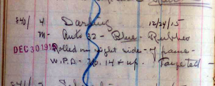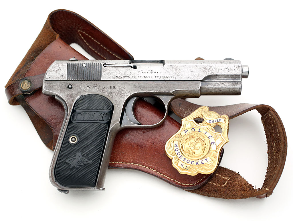 Colt Model 1903 Pocket Hammerless .32 ACP serial number 196547 Factory Roll Marked "W.P.D. No. 18" on right side of frame - Model M .32 with factory rollmark "W.P.D. No. 18" on right side of frame above grip. This was one of 21 guns marked "W.P.D. No. 1-21" on the frame ordered by the Woonsocket, Rhode Island Police Department. Pistols with this marking were shipped between March 3, 1915 - March 6, 1919.  Five .380 caliber Model M pistols marked "W.P.D. No. 1-5" sn 107889 - 108903 were shipped on March 13, 1930.