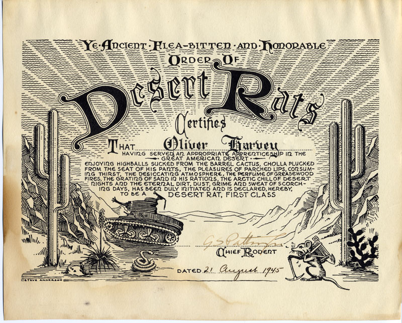 Original signed Certificate Inducting Oliver C. Harvey into General Patton's Desert Rats -  "Ye Ancient Flea Bitten and Honorable Order of Desert Rats Certifies that Oliver Harvey having served and appropriate apprenticeship in the Great American Desert enjoyed highballs sucked from the barrel cactus, cholla plucked form the seat of his pants, the pleasures of parched lips, consuming thirst, the desiccating atmosphere, the perfume of greasewood fires, the grating of sand in his rations, the arctic chill of desert nights and the eternal dirt, dust, grime and sweat of scorching days, has been duly initiated and is declared hereby, to be a DESERT RAT, FIRST CLASS signed G.S. Patton, Jr., Chief Rodent, Dated 21 August 1945."