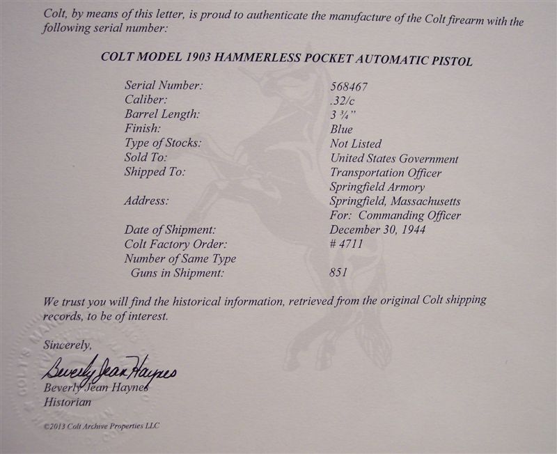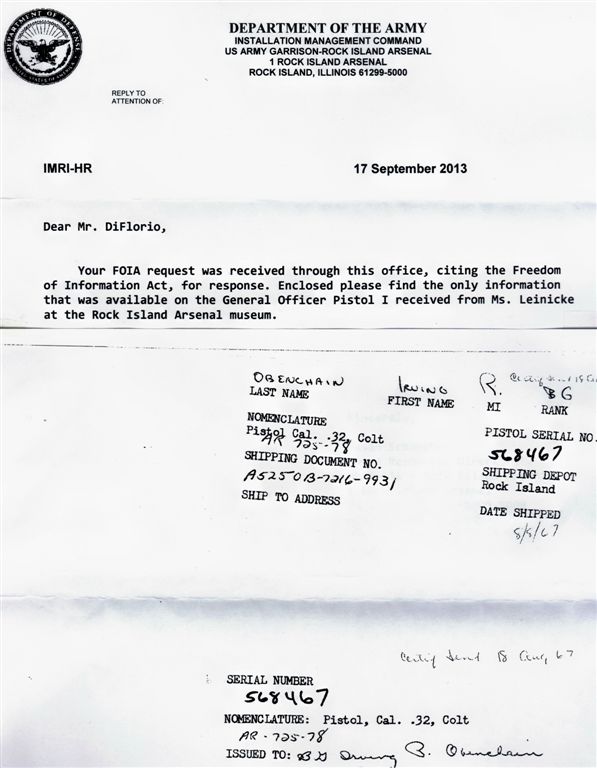 Colt Model 1903 Pocket Hammerless .32 ACP sn 568467 - Issued to Brigadier General Irving R. Obenchain, USA