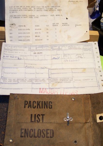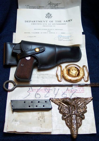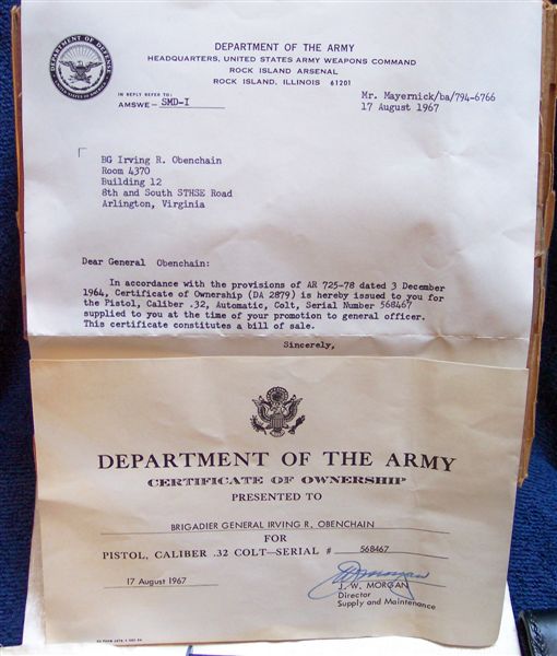 Colt Model M .32 ACP serial number 568467 - Military Model M .32 ACP pistol, arsenal refinished finish, parkerized trigger, thumb safety and grip safety, with U.S. PROPERTY mark on right side of frame and ordnance wheel on left rear of frame behind thumb safety.  Pistol is documented as having been issued to Brigadier General Irving R. Obenchain and is pictured with its canvas foil lined Vietnam era bag numbered to the gun.