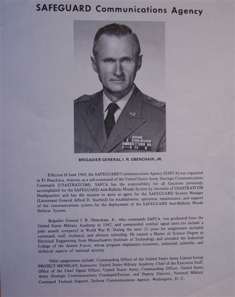 Brigadier General Irving R. Obenchain was born in Birmingham, Alabama. He was a 1942 Honor Graduate of the US Military Academy at West Point, New York. His military schooling includes the Signal School at Fort Monmouth, N.J., the Command and General Staff College, and the Industrial College of the Armed Forces (1958). He earned his master's degree in electrical engineering from Massachusetts Institute of Technology (MIT) in 1951. General Obenchain is listed in Who's Who in America. He had been an amateur radio operator (W2SMA) since 1942, and held a patent for design of a Digital Telephone Switching System. He had served in the U.S. Army during World War II, as commander of the 295th Joint Assault Signal company (JASCO), (15 June 1943 - 6 February 1945) then to the Army's Test and Evaluation Command as Director of Electronic Testing, at the Aberdeen Proving Ground, Maryland. He was then assigned to the General Staff, US Army as Chief of Operations Division G-4 (Logistics) Section, 8th Army, Korea, then assigned to the Signal Agency of White Sands Proving Ground (1959) and the Office of the Chief Signal Officer, Washington DC. Then as Chief of Technical Staff, U S Army Signal Research and Development Laboratory, Fort Monmouth, New Jersey. He then went to GHQ, Southwest Pacific Area eventually rising to the rank of Brigadier General. He served in three wars, World War II, Korea and Vietnam. He was awarded The Legion of Merit and Distinguished Service Medal. He retired from U.S. Army in 1972. After retirement from the Army, he worked for Technology Service Corp, and TRW until 1987.